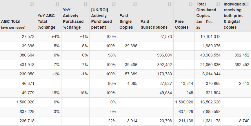 Year-on-year comparisons are still published and remain meaningful. Where titles have moved from separate print and digital certificates to a single combined certificate, ABC has adjusted previous figures to ensure like-for-like comparison.