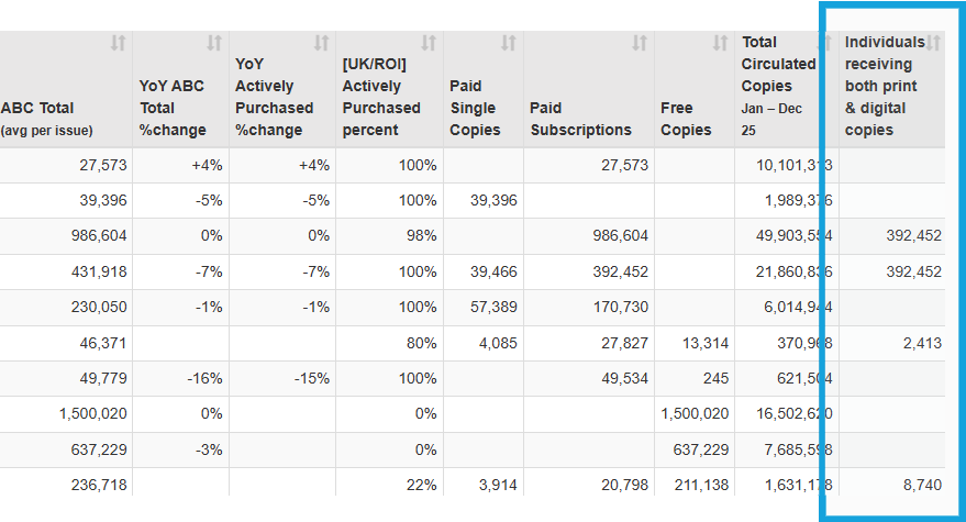 What’s new is greater transparency. ABC certificates and reports now clearly show how many individuals receive both print and digital copies, typically as part of a subscription package.