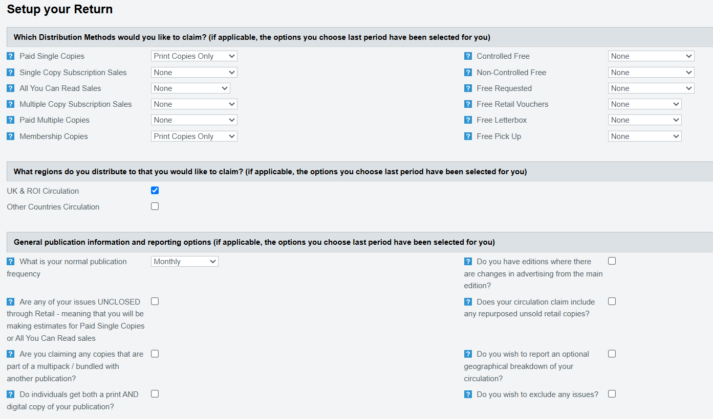- Choose the circulation categories you will claim and any optional reporting settings.